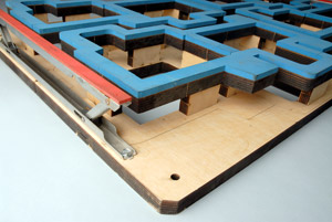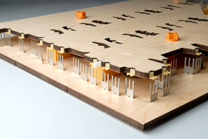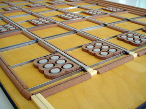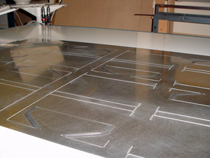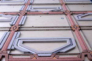 Hochleistungsstanzform mit wasserstrahlgeschnittenem Gummi und geschliffenen Kontur- Metallblöcken für Gegenritzungen (für Lagenspaltung des Kartons) |